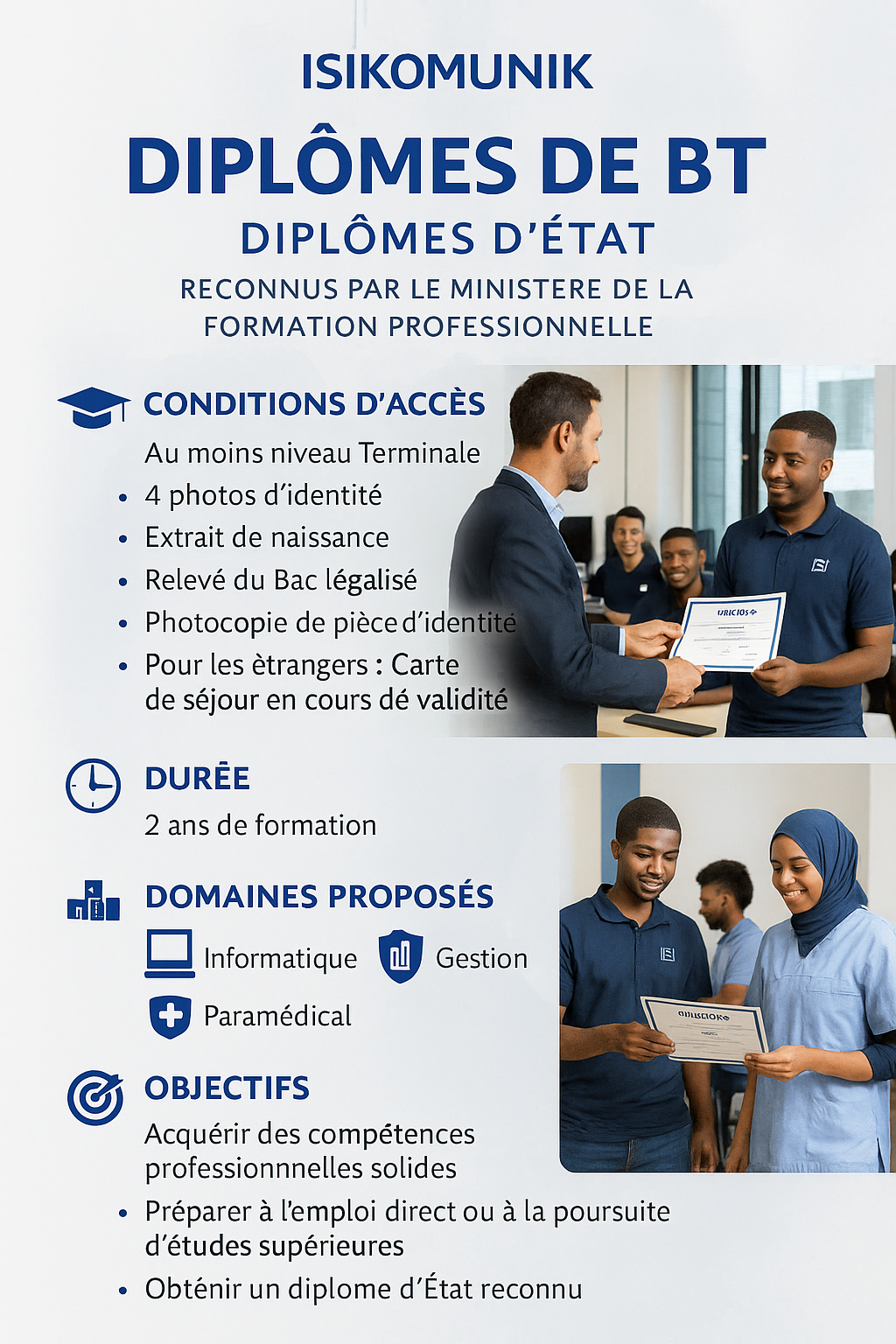Les Diplômes de BT (Brevet de Technicien) délivrés par ISIKOMUNIK sont des diplômes d’État officiels, reconnus par le Ministère de la Formation Professionnelle. Ils préparent les étudiants à des métiers techniques et de gestion très demandés sur le marché du travail, tout en ouvrant la voie à des études supérieures.