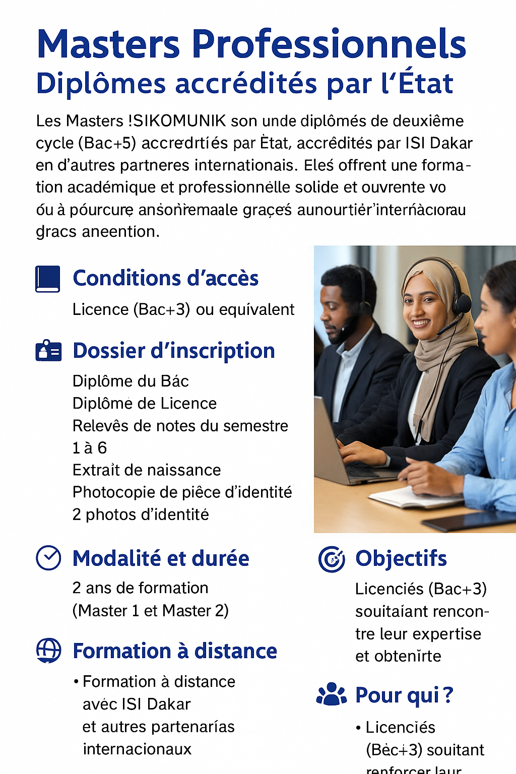 Les Masters Professionnels ISIKOMUNIK sont des diplômes de deuxième cycle (Bac+5) accrédités par l’État, en partenariat avec ISI Dakar et d’autres partenaires internationaux.