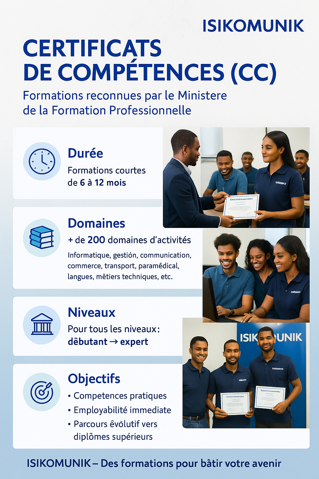 Les Certificats de Compétences d’ISIKOMUNIK sont des formations qualifiantes, officiellement reconnues par le Ministère de la Formation Professionnelle de Mauritanie. Ils constituent une réponse concrète aux besoins du marché du travail et aux aspirations des apprenants, qu’ils soient en début de parcours ou déjà expérimentés.